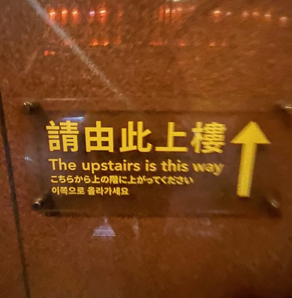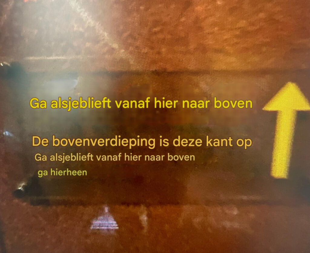 The upstairs is this way. Pijltje: ‘up’. Ik heb de foto door Google Translate gerost. Ik had nooit eerder een afbeelding laten vertalen. Onwerkelijk dat de Nederlandse tekst opeens in de foto staat, voor beide talen, in dezelfde kleur als het origineel. Je bent nooit te oud om met software te spelen.